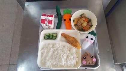 今日の献立は、タラのフライ・豚肉と厚揚げの煮物・あっさりきゅうり・ごはん・牛乳です。