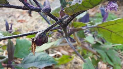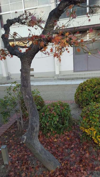 なすびに実ができいます。大きくなればいいのですが。もみじも終わりです。地面に赤いじゅうたんができていました。