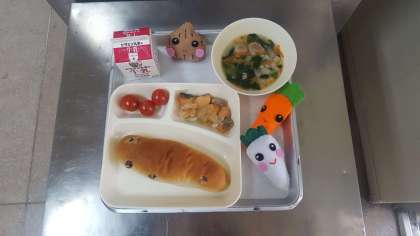 今日のメニューは、鮭のマリネ・肉団子と麦のスープ・プチトマト・レーズンパン・牛乳です。