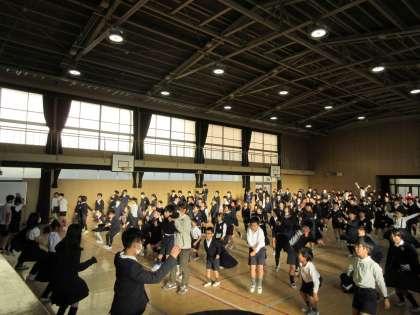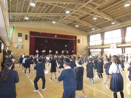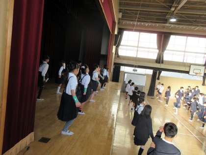 今日の児童集会は、姿勢体操の発表会でした。子ども達が、舞台上で姿勢体操の発表をしました