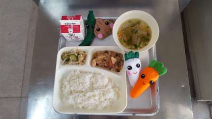 今日の献立は、焼き肉・五目汁・きゅうりともやしのおひたし・ごはん・牛乳です。