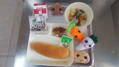 2学期最終のメニューは、鶏肉とジャガイモのスープ・きのこのドリア・ミニフィッシュ・ソフトマーガリン・コッペパン・牛乳です。