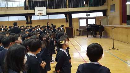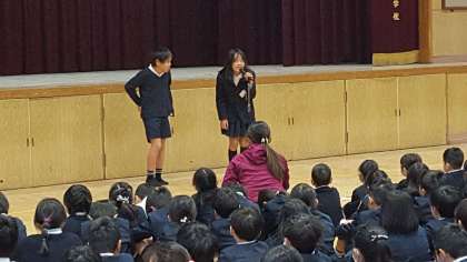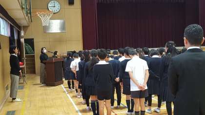 今週の看護当番の引継ぎを行い、新年1回目の校歌を歌いました。屋根に当たる雨音が響く、静けさの中、始業式が終わりました。