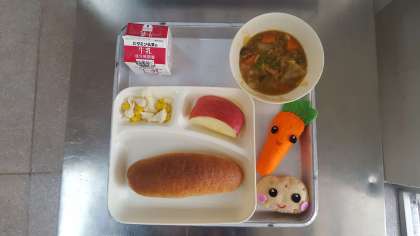 今日のメニューは、豚肉と野菜のカレー煮・カリフラワーとコーンのサラダ・リンゴ・ライ麦パン・牛乳です。