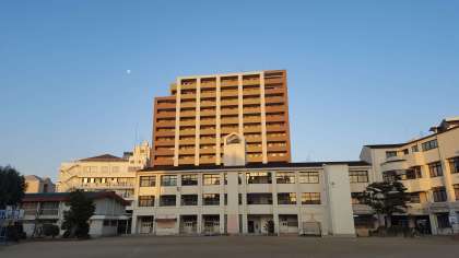 朝日に照らされた校舎です。西の空には月が残っています。空気の澄んだ、すがすがしい週の始まりです。