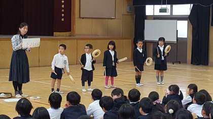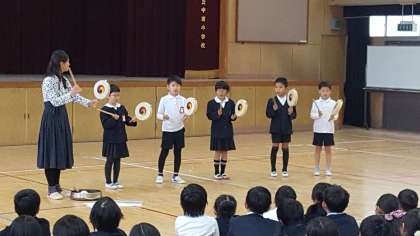 1・2年生は、小さいソゴをたたきました。1年生と2年1組の様子です。