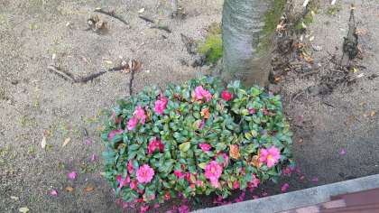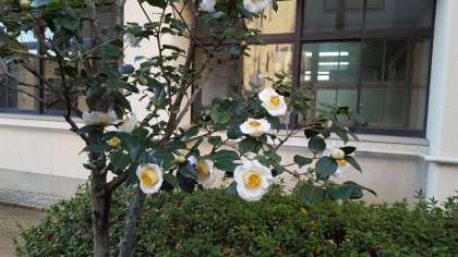 おはようございます。気温3度・湿度83%、天気は晴れ。冷え込んだ寒い朝です。学校北側の山茶花と椿です。道路から見ることができます。とてもきれいです。