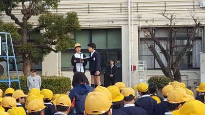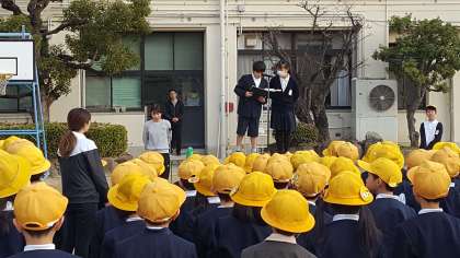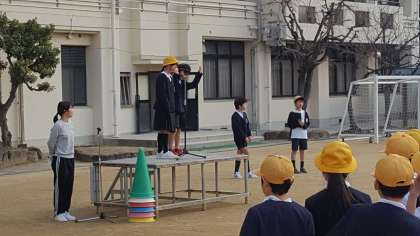 今年になって1回目の、児童朝会がありました。校長先生からは、かけ足タイム・百人一首大会をがんばろうというお話がありました。その後に看護当番の引継ぎがあり、運動委員会からかけ足タイムのお知らせがありました。