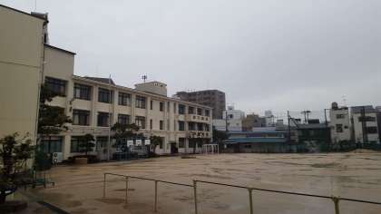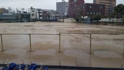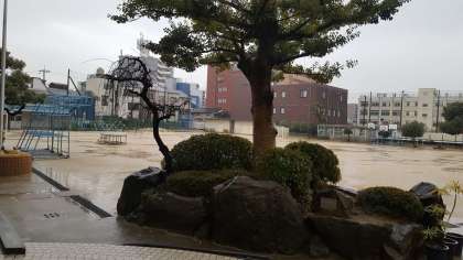 運動場も池のようになっています。今日は運動場は使えません。かけ足タイムも中止です。