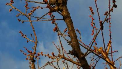 これは、紅梅ではありません。桜です。2月に咲くのではないかと思ってしまいます。1年生のチューリップも芽が大きく伸びてきました。春が近いのではないでしょうか。