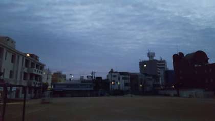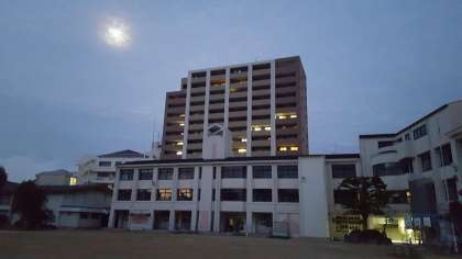 おはようございます。気温4度・湿度66%、天気は晴れ。風も弱く穏やかな朝です。夜明け前の学校の様子です。とっても静かです。西の空には、まだ月が残っています。