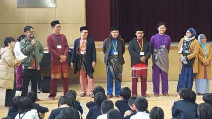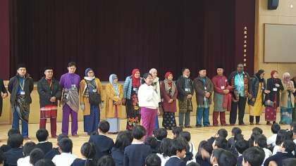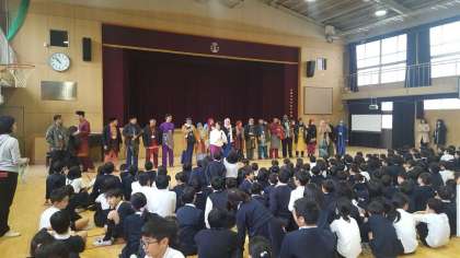 講堂で子ども達との全体交流会を行いました。子どもたちは大歓迎で迎えてくれました。研修員の皆さんは、1人ずつ日本語で自己紹介をしてくださいました。