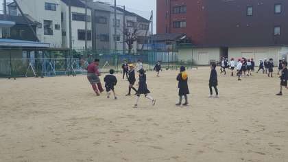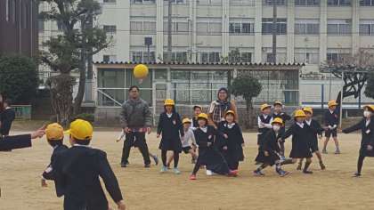 休み時間の運動場の様子です。おにごっこ・ドッジボールをしています。