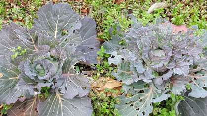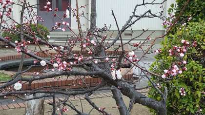 八重のピンクの梅がほころんできました。とてもきれいです。キャベツも大きくなってきました。