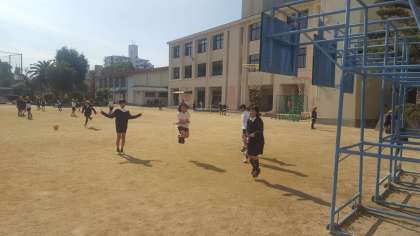 暖かくなったお昼休みの運動場の様子です。子ども達は、今日も元気に走り回っています。今5年生が、縄跳びをする姿をよく見かけます。いい運動なので、これからも続けましょう。