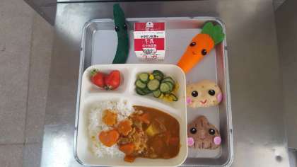 今日の献立は、ポークカレーライス・きゅうりとコーンのサラダ・イチゴ・牛乳です。