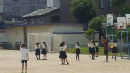 4年生は、理科の学習で、晴れの日の気温を運動場で調べていました。