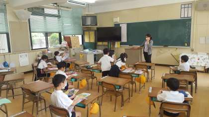 1年生は、算数の授業でした。ドリルで復習し先生に提出していました。