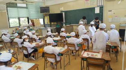 1年生は、給食の配膳の様子です。ルールを守ってきちんと並んでいます。