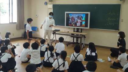 3年生は、外国語活動の授業の様子です。画像が映っているのは、フィリピンかどうかを聞かれ、大きな×で答えていました。