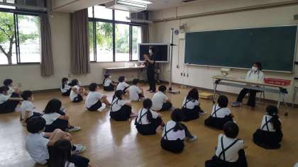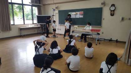 まず間隔をあけて座ってから、養護教諭の熱中症対策のお話を聞ききます。その後に身長・体重を測ります。