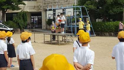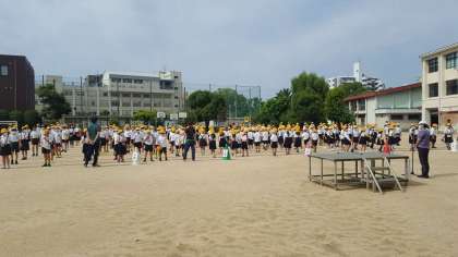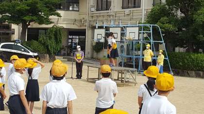 今日は全員がそろっての全校朝会でした。校長先生から、夏至と日食が372年ぶりに重なったというお話がありました。続いて安全パトロールの方の紹介がありました。最後に看護当番からの話がありました。