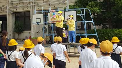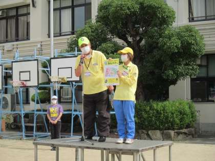 東成区の安全パトロールの方が来校され、全校朝会の時に安全についてのお話をしていただきました。子ども達もしっかりきていました。
