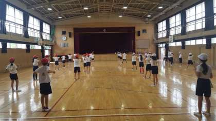4年生は、体育の授業でした。かなり広く周りとの距離を取っています。