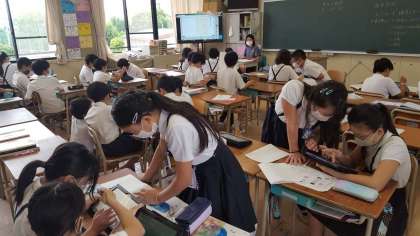 6年生は、国語の授業でした。タブレット端末を使って調べ学習をしていました。