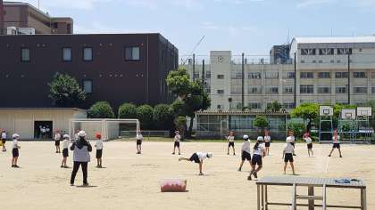 3年生は、体育の授業でした。隣との距離を取りキャッチボールをしていました。