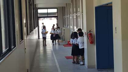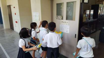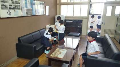 グループで校内を回っている様子です。2年生が説明をして1年生がそれをしっかりと聞いていました。校長室にもやって来てくれました。