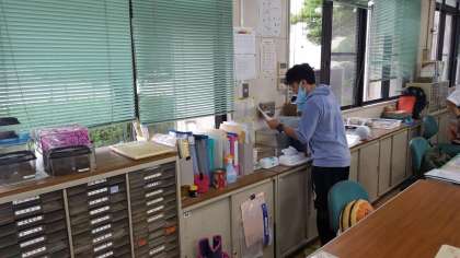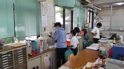今日は全校朝会でしたが、雨で運動場が使えないため、放送で行いました。
