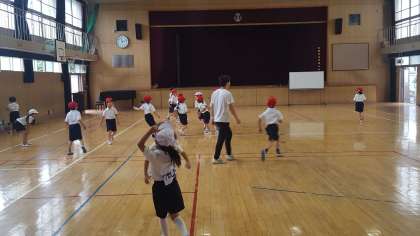 1年生は、体育の授業でした。運動場が使えないので、講堂で走り回っています。