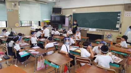 2年生は、学級活動でした。フェイスシールドをして話し合い活動をしていました。