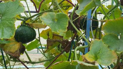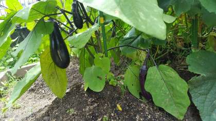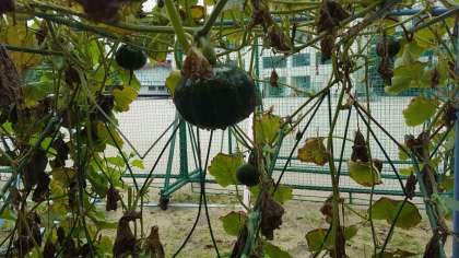 校庭のあちこちで夏野菜が実っています。カボチャやナスは、もう食べられるものもあります。今年は雨が多かったのですが、実ってくれました。
