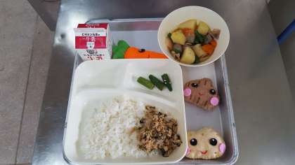 今日の献立は、豚肉とジャガイモの煮物・オクラの梅風味・ツナっ葉いため・ごはん・牛乳です。