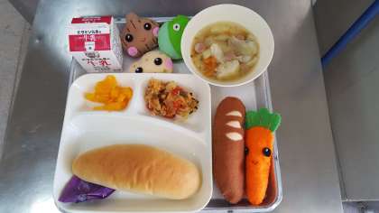 今日のメニューは、パエリア・ウインナーとキャベツのスープ・みかん(缶)・ブルーベリージャム・コッペパン・牛乳です。