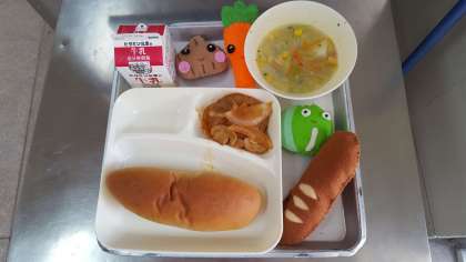 今日のメニューは、煮込みハンバーグ・コーンスープ・黒糖パン・牛乳です。