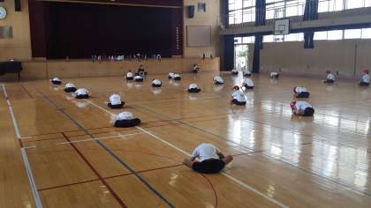 2年生は、講堂で体育の授業でした。体をほぐす運動をしていました。さすがに体は柔らかかったです。 暑い中での学習ですが、子ども達はがんばっています。