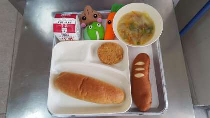 今日のメニューは、チキンレバーカツ・スープ・ライ麦パン・牛乳です。