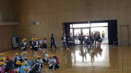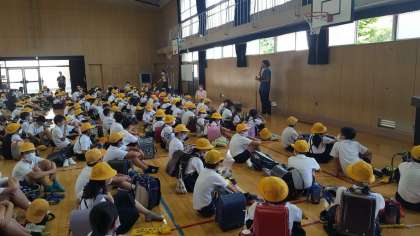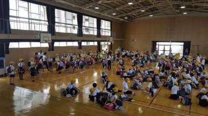 本日の下校時に、台風接近に備えての避難訓練を行いました。暴風警報発令時は、下校時も危険であるので注意するように校長先生から話がありました。担当からも注意を受けた後、登校班に並び替えて集団下校をしました。暑い中での下校になるので、熱中症のも気をつけようとの話もありました。