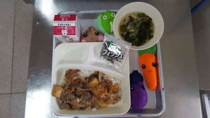 今日の献立は、マーボ厚揚げ丼・中華スープ・ミニフィッシュ・牛乳です。
