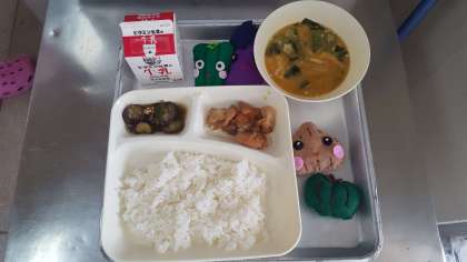今日の献立は、鶏肉の照り焼き・みそ汁・なすのそぼろ炒め・ごはん・牛乳です。