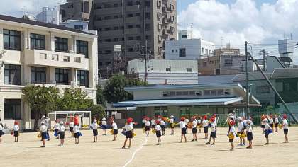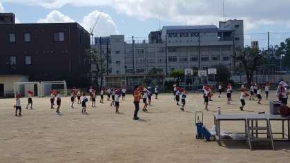 1・2年生は、運動場で運動会の練習をしていました。きらきら光るポンポンを持って、位置を確認しながら踊っていました。