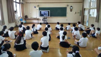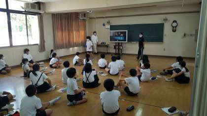 5・6年生は、映像を見て授業をしていました。職業を発音したり、キャラクターが出てきてクイズに答えたりと楽しく学んでいました。