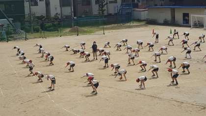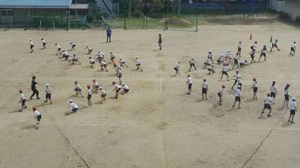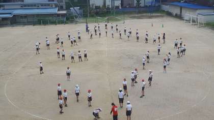 隊形の移動があるので位置を確認しながら、踊っていました。暑い中での激しい動きです。途中で水分補給も行います。みんながんばりましょう。