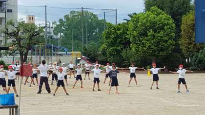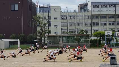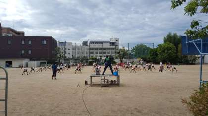 5・6年生の団体演技の様子です。今日は隊形移動ではなく、踊っているシーンを紹介します。子ども達は、腰を低く落として気合を入れて演じていました。とてもかっこよかったです。