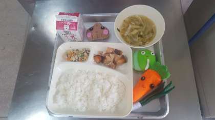 今日の献立は、さけのしょうゆ風味焼き・五目汁・高野豆腐の炒り煮・ごはん・牛乳です。