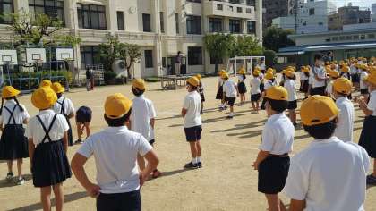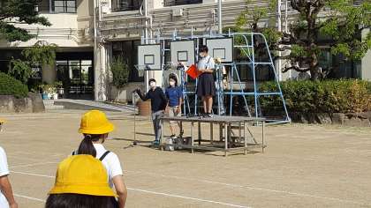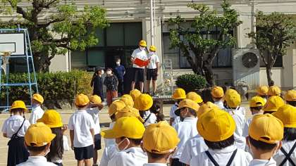 今日はよい天気になり運動場で全校朝会を行いました。校長先生の話の後に、看護当番から先週の反省と今週の目標についての話がありました。今朝は風がさわやかで気持ちがよかったです。