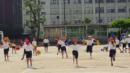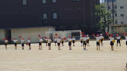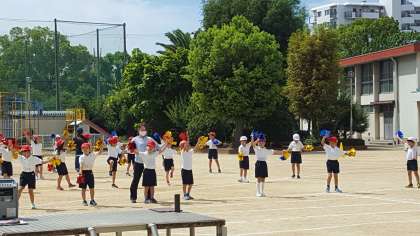 曲に合わせてリズムにのって楽しく踊っていました。隊形の変化もスームズで、手に持っているポンポンも青空に映えていました。見ている方も笑顔になってきました。